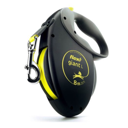 Povodec Flexi – Giant je narejen iz še posebej trpežne in kakovostne plastike. Trakovi so iz kakovostnega poliamida (oz. nylona) ter prenesejo visoke obremenitve večjih psov.
