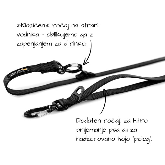 Povodec ima poleg običajnega ročaja za roko, še dodaten ročaj (na strani, kjer zapnemo psa), ki služi za hitro prijemanje ali za nadzorovano hojo psa ob nogi.