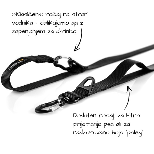 Povodec ima poleg običajnega ročaja za roko, še dodaten ročaj (na strani, kjer zapnemo psa), ki služi za hitro prijemanje ali za nadzorovano hojo psa ob nogi.