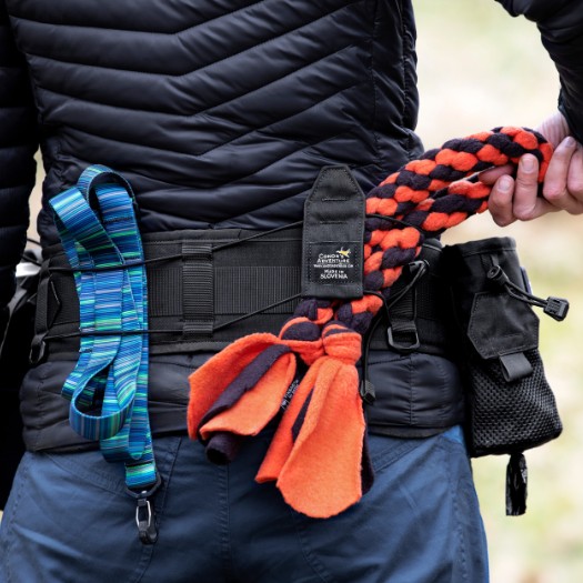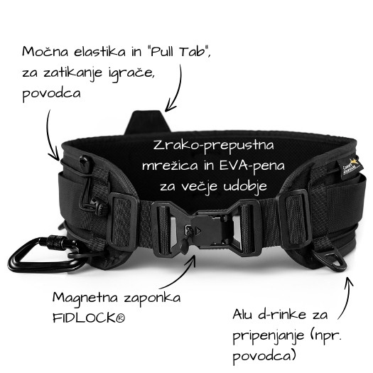 Čez zadnji del pasu je napeljana močna elastika, ki služi spravljanju povodca ali poljubne pasje igrače.